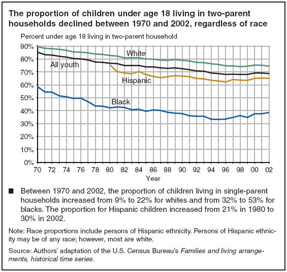 A recent study by McCurley and Snyder explored the relationship between family structure and self-reported problem behaviors. The central finding was that youth ages 12–17 who lived in families with both biological parents were, in general, less likely than youth in other families to report a variety of problem behaviors, such as running away from home, sexual activity, major theft, assault, and arrest. The family structure effect was seen within groups defined by age, gender, or race/ethnicity. In fact, this study found that family structure was a better predictor of these problem behaviors than race or ethnicity. The family structure effect emerged among both youth who lived in neighborhoods described as “well kept” and those in neighborhoods described as “fairly well kept” or “poorly kept.” For these reasons, it is useful to understand differences and trends in youth living arrangements. However, it is important to note that family structure may not be the proximate cause of the youth behavior, but rather the conditions often linked with it. About 7 of every 10 children live with married parents Analyses of the 1960 decennial census found that 88% of children under age 18 lived in two-parent families. The Census Bureau’s Current Population Survey found that the proportion of children living in two-parent families declined throughout the 1970s and the 1980s and through the first half of the 1990s. In 2002, 69% of children were living in two-parent families—a level that has held since the mid-1990s. Most other children lived in oneparent households. (Even if a second adult is present and is a biological parent or functions in a parental role, the Census Bureau still classifies the household as single-parent if the two adults are unmarried.) The proportion of children living in single-parent households increased from 9% in 1960 to 27% in 2002. Historical data are not available to document the changing proportion of children who live with two unmarried biological parents. However, the Survey of Income and Program Participation (SIPP) captured this distinction for 1996. SIPP found that only 2% of children lived in families with two unmarried biological parents in 1996. This proportion varied with race and ethnicity: white non-Hispanic (2%), black (2%), American Indian (6%), Asian (1%), and Hispanic (5%). SIPP also found that 69% of U.S. children under age 18 lived with married parents. This proportion was highest for Asian (82%) and white non- Hispanic (77%) children, lower for Hispanic (64%) and American Indian (56%) children, and lowest for black children (35%). According to the Census Bureau, most children who live in singleparent households live with their mothers. The proportion of children living with their mothers in singleparent households grew from 8% of the juvenile population in 1960 to 23% in 2002. In 1970, the mothers of 7% of the children living in singlemother households had never been married; this proportion grew to 42% in 2002. The proportion of children living with their fathers in one-parent households grew from 1% in 1960 to almost 5% in 2002. In 1970, the fathers of 4% of the children living in single-father households had never been married; this proportion grew to 38% in 2002, a pattern similar to the mother-only households. The Census Bureau found a major difference between mother-only and father-only households: cohabitation (living with an unrelated adult of the opposite gender who is not one’s spouse) was much more common in father-only households. In 2002, children living in single-parent households were three times more likely to have a cohabiting father (33%) than a cohabiting mother (11%). Some children live in households headed by other relatives or by nonrelatives. In 2002, 3% of children lived in households headed by other relatives, with about 3 of every 5 of these children living with a grandparent. (Across all household types, 8% of children lived in households that included a grandparent.) In 2002, 1% of all children lived with nonrelatives. Most children live in families with at least one parent in the labor force Overall, 88% of children in 2002 lived in families with one or both parents in the labor force. (Being in the labor force means that the person is employed or is actively looking for work.) Of all children living with two parents, 97% had at least one parent in the labor force, and 62% had both parents in the labor force. When just one parent in twoparent families was in the labor force, 87% of the time it was the father. Among children living in single-parent households, those living with their fathers only were more likely to have the parent in the labor force than those living with their mothers only (89% versus 77%). Children in single-parent families are more likely to live in poverty ![]() caption here?? The economic well-being of children is related to family structure. In 2002, 17% of all juveniles lived below the poverty level. However children living in two-parent families were far less likely to live in poverty (8%) than were children living with only their fathers (19%), only their mothers (38%), or neither parent (48%). Viewed another way, more than half (52%) of all children living below the poverty level in 2002 were living in single-mother families and about one-third (32%) were living in two-parent families.